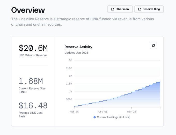 第25期Chainlink儲備金 $LINK 流入已至🫡 儲備金目前總計 1,675,112 $LINK(約 2060 萬美元),平均成本為每 $LINK 16.48 美元 今天收購了 88,845 個 $LINK(約 110 萬美元),其中約 90% 來自通過Uniswap交換成 $USDC 的 $LINK,約 10% 來自已支付的用戶費用 $LINK。 該儲備金的資金來源包括鏈下企業交易收入和鏈上服務使用收入,從而支持網絡的長期經濟可持續性。 每週都有資金流入,預計未來幾年內不會從儲備金中提取資金。