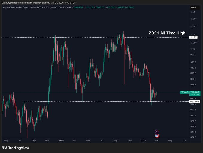 競爭幣總市值一直維持在 2025 年 4 月的低點。 這樣一來,它幾乎在該區域和 2021 年高點之間建立了一個巨大的區間,而該高點在本週期中也多次起到了阻力作用。
