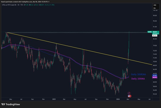 $OIL 自中東局勢升級以來,油價已上漲約 35%。 出於多種原因,這並非好兆頭。油價持續上漲也表明,市場對局勢迅速解決並不抱有信心。 值得持續關注,將其作為衡量風險偏好的指標。油價越高,短期風險形勢就越嚴峻。 twitter.com/DaanCrypto/status/...