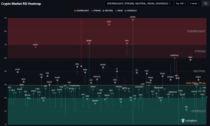 受近期反彈的影響,前100種加密貨幣的周線相對強弱指數(RSI)水平已大幅上升。 此前,它們的水平已深陷熊市。 目前平均值約為40,表明高時間框架的整體動能仍然非常疲弱。但我們可以看到,短短几天的上漲就能迅速改變這一局面。 有利的一面是,如果價格進一步回落,周線圖再次出現過熱現象所需的時間將會很長。