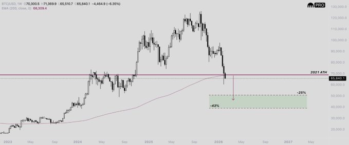 每一次熊市,$BTC 都會跌破 200 週均線,並向下偏離,最終觸底。 2015 年:-35% 2018 年:-25% 2022 年:-43% 如果我們在這裡跌破 200 週均線,那麼最終觸底的偏離百分比將與此類似。