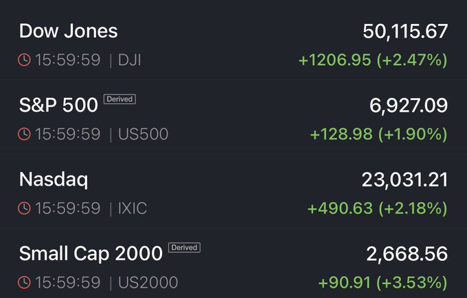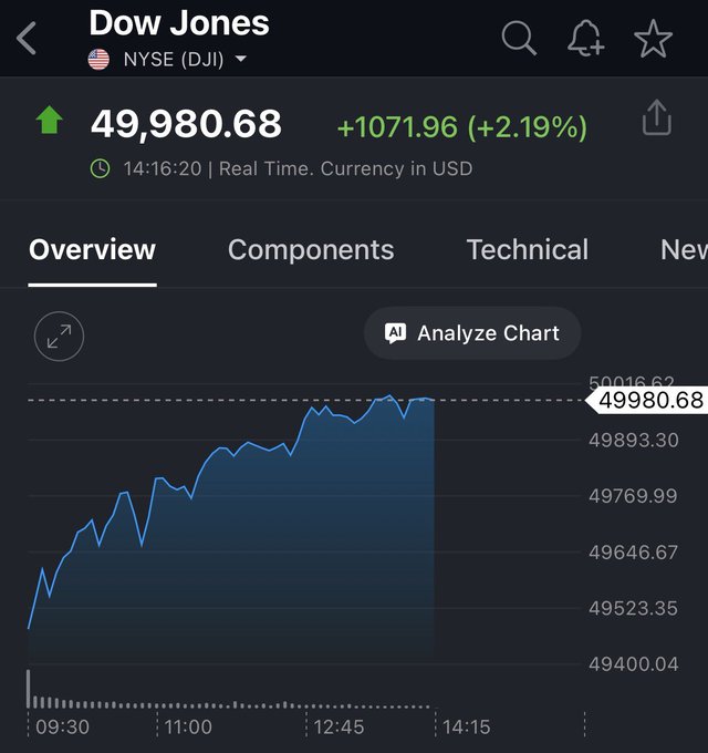 突發:道瓊斯指數當日漲幅擴大,累計超過1000點。 道瓊斯指數重返50000點大關。