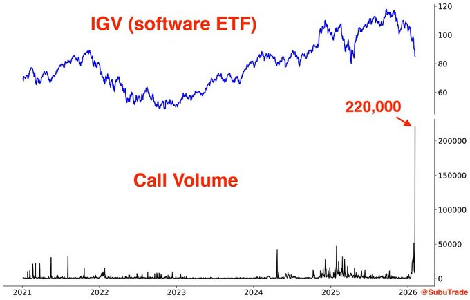 投資者押注美國軟件股反彈: 科技軟件ETF(IGV)的看漲期權成交量週三飆升至創紀錄的22萬份合約。 這一數字是2025年初創下的歷史高點的4倍。 與此同時,IGV今年迄今已下跌25%,跌至2025年4月以來的最低水平。 自2025年9月以來,該科技軟件ETF的價格已下跌33%。 因此,IGV相對於標普500指數的權重已跌至2018年1月以來的最低水平。 僅1月份,標普北美軟件指數就下跌了15%,創下自2008年10月以來的最大單月跌幅。 軟件股的拋售似乎已經過度。