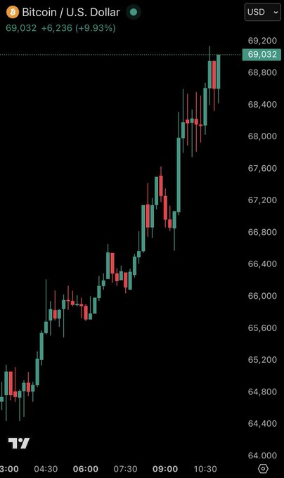 突發新聞:比特幣和ETH當日漲幅超過 10%,分別收復 69,000 美元和 2,000 美元。 twitter.com/KobeissiLetter/sta...