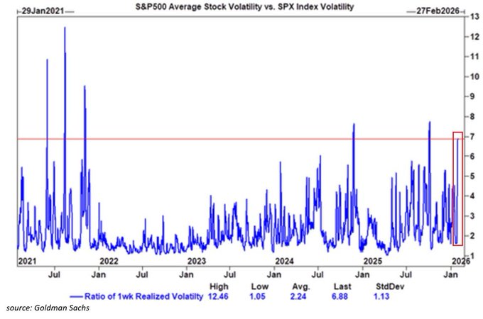 市場波動性正在暗潮湧動: 標普500指數成分股的平均波動率目前是整個指數波動率的7倍。 過去兩週,個股平均波動率與標普500指數波動率的比值翻了一番還多。 自2022年以來,個股波動率達到如此之高的時期僅有兩次,分別是在2024年12月和2025年10月。 波動性正在迅速回歸。
