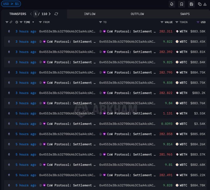 地址 0x455…A433E 過去 7 小時將 14145.93 WETH 換倉為 492.16 WBTC,價值 4419.5 萬美元,平均成本 $89796.47,目前浮盈 21.3 萬美元