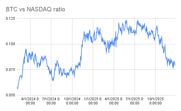 BTC與 NASDAQ 指數的比率已經回吐了過去一年的所有漲幅,回到了 2024 年 11 月總統大選前的水平。