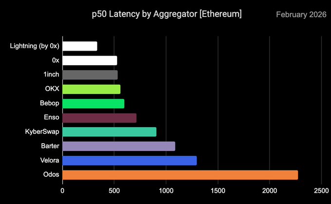 來自聚合器大戰前線的另一份報道: 本次測試中,@matchametaxyz 在 2026 年 2 月的 p50 延遲(毫秒)(數值越低速度越快) p50 = 返回可用報價的中位數時間(一半報價返回速度更快,一半報價返回速度更慢),二月份平均值 以太坊優先, ARB,基礎,線程中的 monad