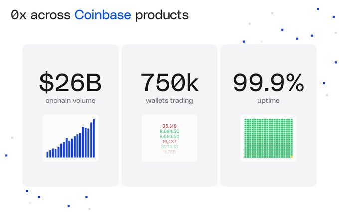 👉 交易量達 260 億美元 支持 Coinbase 是一項重要的工作,交易量高達 260 億美元。 0x 很榮幸成為 Coinbase 信賴的合作伙伴,擁有超過 78 萬個錢包進行交易,並在其不斷擴展的鏈上生態系統中保持著近 100% 的正常運行時間。