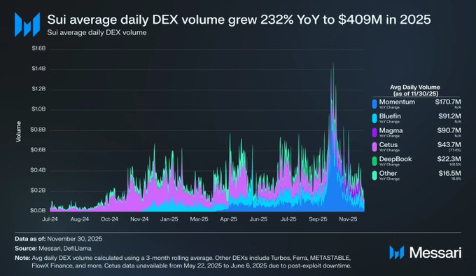 Sui 的鏈上交易活動在 2025 年起飛。 @MessariCrypto 的 2026 年Sui報告顯示,DEX 的日均交易量同比增長 232%,達到 4.09 億美元。 如果你想了解全部細節,這份報告值得一讀👇 http:/messari.co/3L9CH7s