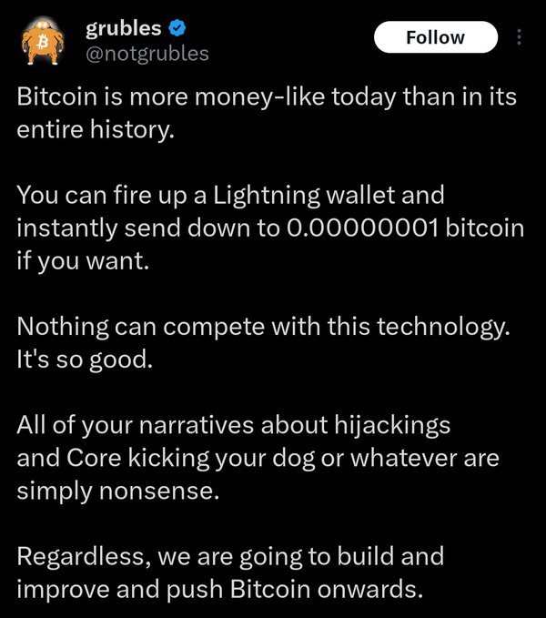 這裡說的每一句話都是謊言。 你不能直接“啟動一個閃電錢包”。你需要一筆鏈上交易(資金和手續費)才能創建一個具有接收能力的錢包,更不用說發送資金了。 這項技術並沒有“那麼好”。無數區塊鏈都具有即時最終性,但費用卻很低,而且不需要託管人、流動性節點、連接良好且資金充足/平衡的通道等等。 比特幣擁護者的策略越來越趨向於:對所有事情都撒謊。