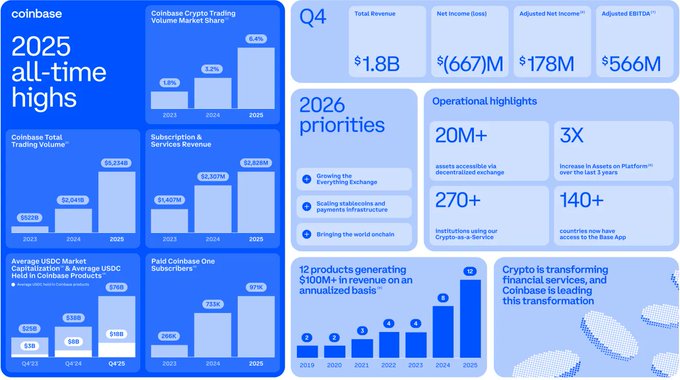Coinbase 發布 2025 年第四季及全年業績報告 Coinbase 公佈其獲利情況:第四季營收 18 億美元,2025 年全年營收 72 億美元。 s27.q4cdn.com/397450999/files/...…