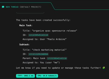 測試 Tether 的 QVAC AI 助手 許多技能已透過 MCP 支持,以下範例使用 Asana(在性能一般的筆記型電腦 GPU 上運行) 100% 本地推理 即將開源