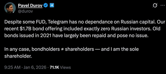 Telegram 首席執行官帕維爾·杜羅夫斷言,Telegram 不依賴俄羅斯的資金,任何認為這一點的信息都是假新聞。 最近發行的17億鎂債券並未吸引任何俄羅斯投資者。 2021年發行的舊債券