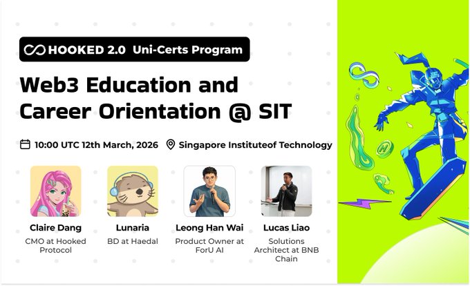 #HOOKED新時代 #HookedUniCerts 來看看新加坡理工大學 Hooked Uni-Certs 項目的演講嘉賓陣容吧! 🎤 Claire Dang — Hooked Protocol首席營銷官 🎤 Lucas Liao — BNB Chain 解決方案架構師 🎤 Leong Han Wai — ForU AI 產品負責人 🎤 Lunaria — 業務拓展,Haedal 從 Web3 的發展和合作到人工智能、DeFi 和區塊鏈基礎設施——SIT 的學生將直接從塑造行業的建設者那裡獲得見解。 🚀 學習。構建。上鍊。