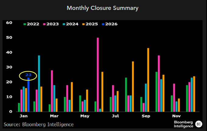 1月ETF清盤數量激增,共有23檔基金退出市場。但真正有趣的是,這些ETF的平均成立時間只有四個月(非常年輕)——這表明,如果產品未能迅速走紅,發行商會迅速止損,尤其是在辣椒醬領域。感謝@SirYappityyapp的精彩發現。