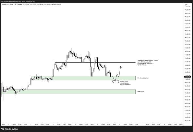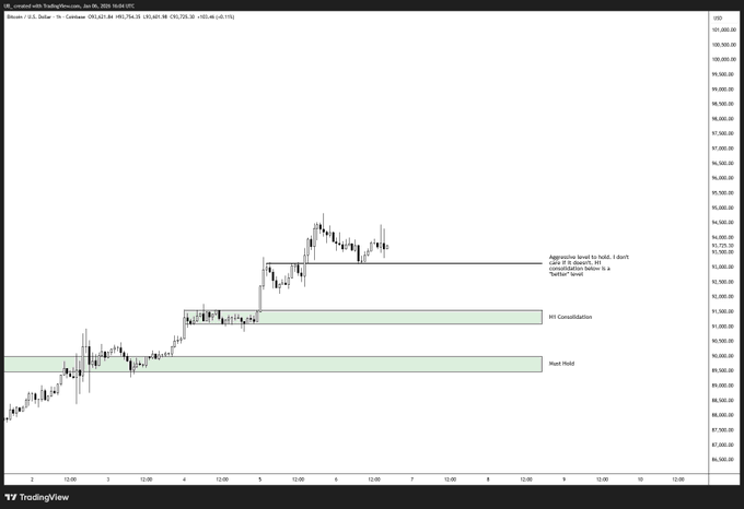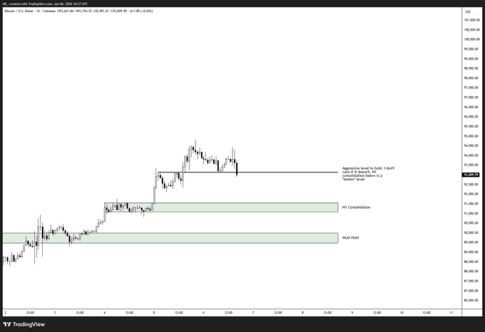 比特幣 / $BTC 有三個關鍵位置需要關注: $93,130 - 激進持有位,不守也無所謂。 $91,560 - H1盤整區,這裡反彈是我認為最理想的。 $90,000 - 多頭必須防守的底線。