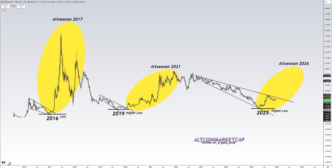 #山寨幣 如果這次的另類賽季比往年晚一年開始呢? 👀 ETH/ BTC圖表看起來已經準備就緒。 我認為2026年將是山寨幣之年。