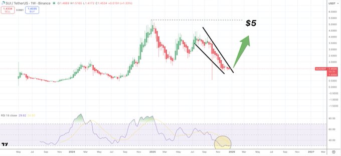 $ Sui/ USDT週報 目前,$SUI 生態系統正處於爆發式成長階段,但周線 RSI 指標從未如此嚴重超賣,基本面與價格之間的差距也從未如此之大📊