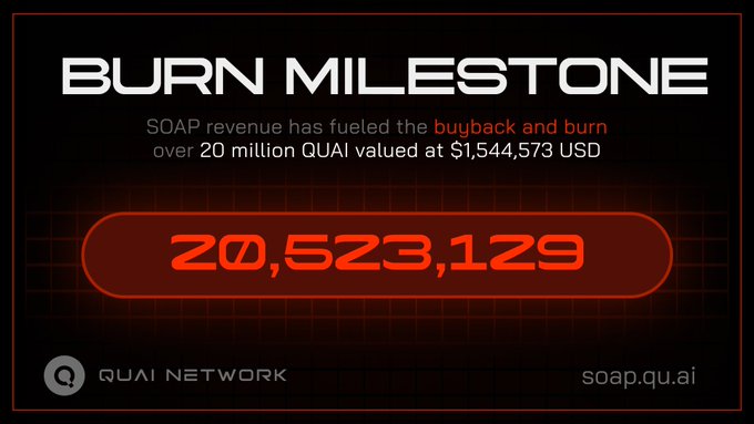 QUAI 銷毀量突破 2000 萬! 補貼型開放市場收購協議 (SOAP) 持續突破每日里程碑。 今天,我們銷毀的 QUAI 總量突破 2,000 萬,過去 24 小時內收入超過 5 萬美元。 是時候提升算力了。