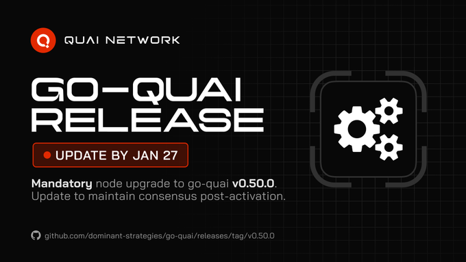 📦最新版本發佈:請在 Prime 節點高度達到 1,330,000 之前(預計 1 月 27 日下午 4 點 CST / 晚上 10 點 UTC)將您的 go-quai 節點升級到 v0.50.0 版本。 v0.50.0 版本更新提高了 SHA 和 Scrypt 算法在 ASIC 上的工作共享深度,並降低了孤立節點率。 此 go-quai 更新不向下兼容。未升級將導致您的節點失去同步。