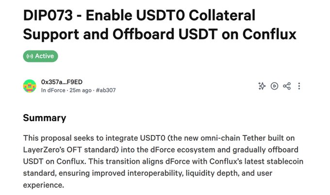 🗳 DIP073 - 啟用 USDT0 抵押支持並在Conflux上卸載USDT 該提案旨在將 USDT0(基於 LayerZero 的 OFT 標準構建的新型全鏈Tether )整合到 dForce 生態系統中,並逐步從Conflux上移除USDT 。 ⚡️閱讀完整提案並立即投票:snapshot.org/#/s:dforcenet.eth/proposal/0xab307373e5cc829e311f72b51106ff26a4e55cc9b01c45ce6445085bf715218d…