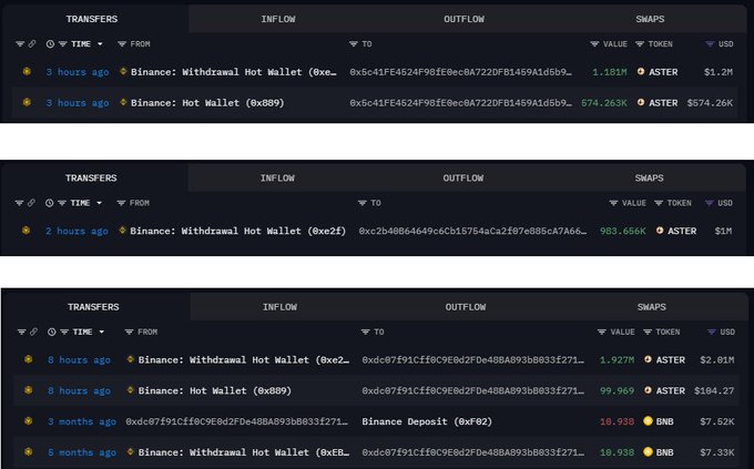在過去 8 小時內,3 個新錢包從 #Binance 共提取了 466 萬 $ASTER (約 479 萬美元)。 平均入金金額為 1.02 美元。 地址: intel.arkm.com/explorer/addres...… intel.arkm.com/explorer/addres...… intel.arkm.com/explorer/addres...…