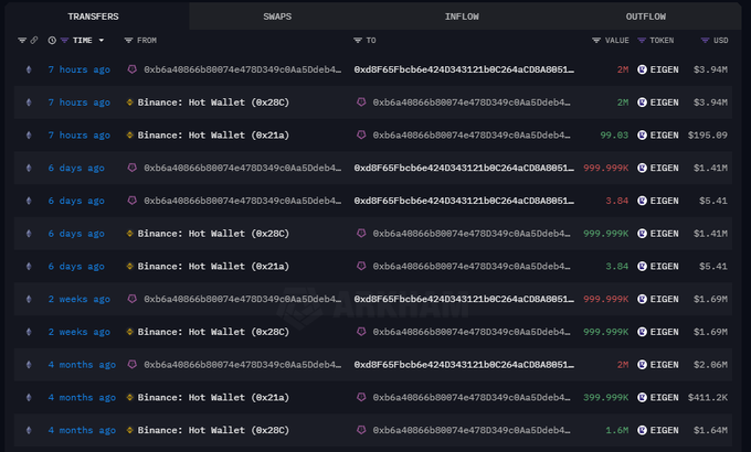 7 小時前,一位巨鯨(可能是 #RedOakCayman)從 #Binance 提取了另外 200 萬 $EIGEN (~394 萬) 剛才,他有 6M $EIGEN (約 1,182 萬美元),未實現利潤約 288 萬美元 地址: intel.arkm.com/explorer/addres...… twitter.com/OnchainDataNerd/st...