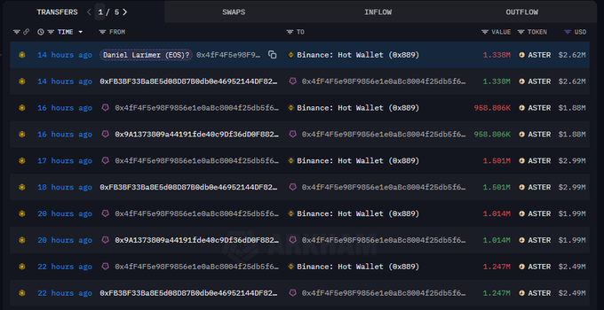 24小時內,一個錢包(可能是#Galaxy_Digital - 持有$ASTER的MM)向#Binance充值了總計610萬 $ASTER(約合1208萬美元)。 目前,他仍然持有5157萬 $ASTER(約合9438萬美元)。 地址: intel.arkm.com/explorer/addres...…