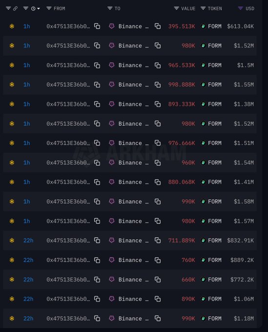 隨著 $FORM 增加 50%,一位巨鯨(可能是 #IOSG_Ventures)在過去 2 天內共存入 3560 萬 $FORM (約 4623 萬美元) 結果,$FORM 的價格下跌了 15% 地址: intel.arkm.com/explorer/addres...…