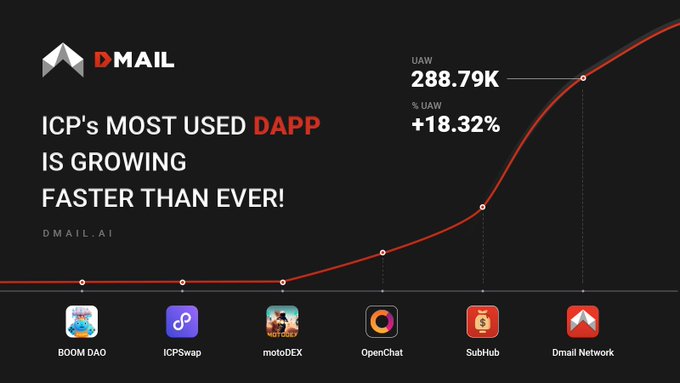 🚀 #Dmail網路是#ICP生態系統的領導者! 作為2021年創世時最早存在的ICP專案,現在已支援38多個鏈,根據@DappRadar顯示,它是@dfinity上使用最多的去中心化應用。 📈 286.57K 24小時活躍使用者(+35.36%)| 800K+ 30天活躍使用者 👉 探索: