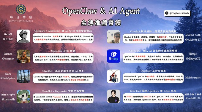 OpenClaw & AI Agent 生態推薦幣讀 📚 @openclaw 生態持續火熱,AI Agent 的敘事也正在轉變,當大家還在炒作迷因幣的 AI 概念, @openclaw 已經把 Agent 變成了能夠自主去賺取收益的生活助手 🤖 幣研整理了關於 @openclaw 的應用場景以及相關的生態文章 👇 @0xJeff @nozmen @NoahEpstein_ @xmayeth @Alvin0617 @BiteyeCN @yaohui12138 twitter.com/CryptoWesearch/sta...