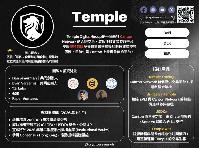 機構級金融建設的崛起 ⚒️ @CantonNetwork 上的領頭羊 @temple_ny 隨著 RWA 與機構級 DeFi 需求的增加, @CantonNetwork 生態也逐漸迎來了爆發。 其中生態的 @temple_ny 在在短短的兩個月內,透過其強大的隱私和合規架構,搖身成為 @CantonNetwork 上最核心的金融基礎建設平台。 下面跟著幣研一起了解 @temple_ny 是什麼 👇 @evanvar @DanSimerman