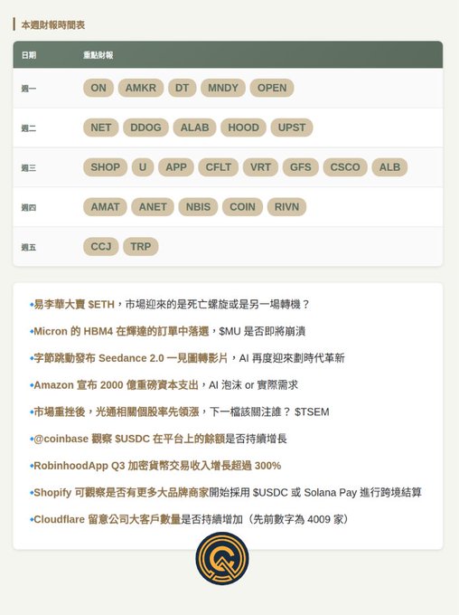 市場全線崩盤後, $DJI 再創新高,🦘行情該留意哪些重點事件 👀 🔹易李華大賣 $ETH ,市場迎來的是死亡螺旋或是另一場轉機? 🔹 @MicronTech 的 HBM4 在輝達的訂單中落選, $MU 是否即將崩潰 🔹字節跳動發布 Seedance 2.0 一見圖轉影片, AI 再度迎來劃時代革新 🔹 @amazon 宣布 2000 億重磅資本支出, AI 泡沫 or 實際需求 🔹市場重挫後,光通相關個股率先領漲,下一檔該關注誰? $TSEM 🔹 @coinbase 觀察 $USDC 在平台上的餘額是否持續增長 🔹 @RobinhoodApp Q3 加密貨幣交易收入增長超過 300%, 佔交易總收入的三分之一。收購 Bitstamp 並擴展國際(尤其是歐盟) 加密業務是當時的核心戰略,但當前加密市場不樂觀的情況下, 該公司是否維持增長態勢 🔹 @Shopify 可觀察是否有更多大品牌商家開始採用 $USDC 或 Solana Pay 進行跨境結算 🔹 @Cloudflare 留意公司大客戶數量是否持續增加 ( 先前數字為 4009 家 ) ===== 🦅 本週財報重點關注: ▫️週一: $ON $AMKR $DT $MNDY $OPEN ▫️週二: $NET $DDOG $ALAB $HOOD $UPST ▫️週三: $SHOP $U $APP $CFLT $VRT $GFS $CSCO $ALB ▫️週四: $AMAT $ANET $NBIS $COIN $RIVN ▫️週五: $CCJ $TRP twitter.com/CryptoWesearch/sta...
