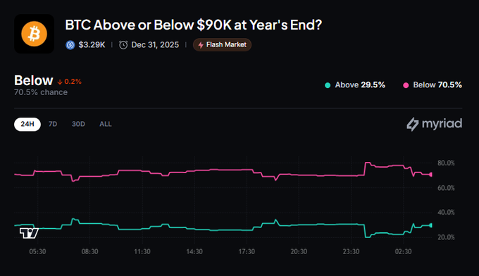 年底比特幣價格會高於還是低於 9 萬美元? 目前,市場正朝著一個方向發展。 比特幣在 12 月下旬的大部分時間裡都徘徊在 9 萬美元以下,由於假期流動性不足,交易價格在 8 萬美元以上徘徊。 多次試圖收回 9 萬美元的努力均告失敗,賣家不斷出現在這個價位附近。 這種猶豫情緒在@MyriadMarkets 上表現得非常明顯。 當前賠率: • 低於 9 萬美元:70.5% • 9萬美元以上:29.5% • 交易額 3300 美元 • 市場將於2025年12月31日解決 這裡發出的信號並非看跌恐慌,而是現實主義。 股市在年底經歷了緩慢上漲的趨勢,但比特幣通常需要強勁的流動性或催化劑才能突破關鍵水平。 由於假期交易量減少,加上 9 萬美元的阻力位,交易員們押注BTC最終價格將略低於此價位。 這就是其中的細微差別。 一次簡單的推動就可能迅速改變市場格局,但目前市場普遍預期價格會波動,而不是突破。 只剩幾天了。 BTC能否重回 9 萬美元以上……還是會在年底略低於這個價格?
