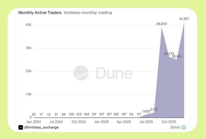 交易者不斷回歸是有原因的。 @trylimitless 的每月活躍交易者數量剛剛創下歷史新高。 12 月活躍交易者已超過 41,000 人, 而現在甚至還沒過半。 不久前,這個數字還只有幾百隻。 現在已經達到數萬人。 這種成長並非源於噪音。 而是源自於一款使用者能夠理解、使用並願意再次使用的產品。 如果這是 12 月中旬的數據, 你認為到月底這個數字會達到多少?