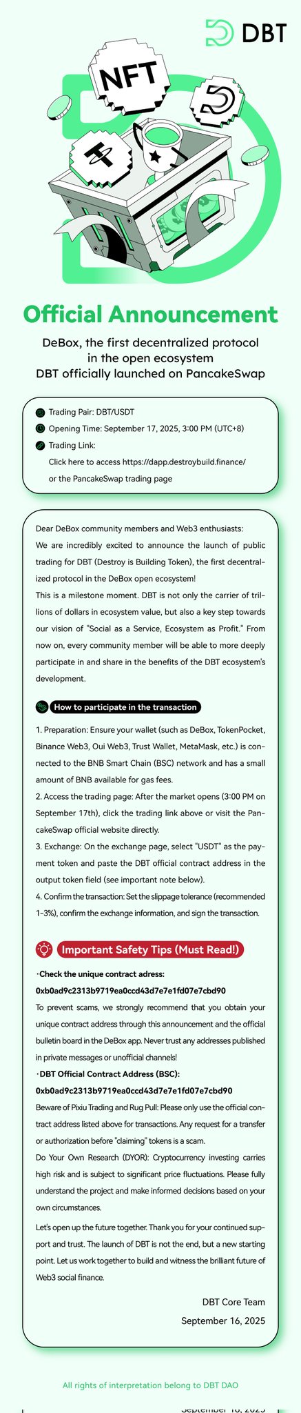 📢 官方公告 🚀 DeBox開放生態系統首個去中心化協議——DBT 即將在PancakeSwap上線! 📍交易對:DBT/ USDT ⏰ 上線時間:2025年9月17日15:00(UTC+8) 🔗 立即交易:dapp.destroybuild.finance 或PancakeSwap #DeBox #DBT #Web3