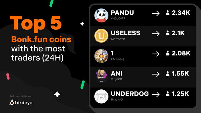 是時候看看哪些代幣吸引了最多的交易者了。🕵️ 大盤代幣不再總是引領市場走勢。小盤代幣正顯示出上漲空間。 以下是@bonk_fun上按交易者數量排名的前幾位代幣(過去24小時): $PANDU $USELESS $1 $Ani $Underdog (1/2)