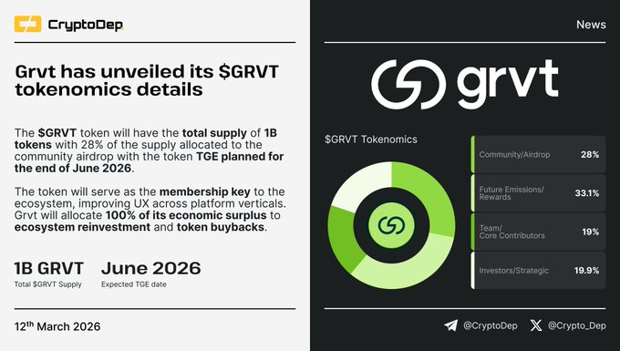 ⚡️ @Grvt_io 公佈了其代幣經濟模型詳情。 #GRVT 代幣總供應量為 10 億枚,其中 28% 將用於社區空投,代幣生成活動 (TGE) 計劃於 2026 年 6 月底進行。該代幣將作為生態系統的會員金鑰,提升各平台垂直領域的使用者體驗。 👉