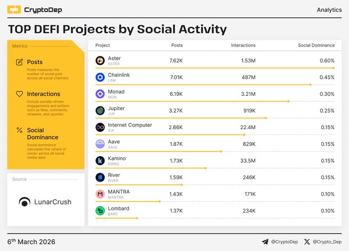 ⚡️按社交活躍度排名的頂級 DeFi 項目 $ASTER $LINK $JUP $MON $ICP # ICP $AAVE $KMNO $RIVER $MANTRA $BARD