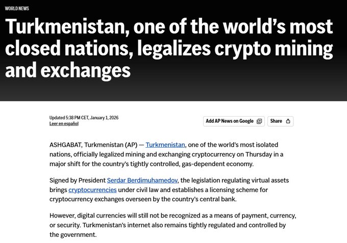 最新消息:土庫曼斯坦已將比特幣挖礦和交易合法化。 這項由總統塞爾達爾·別爾德穆哈梅多夫簽署的新法案已於本週生效。