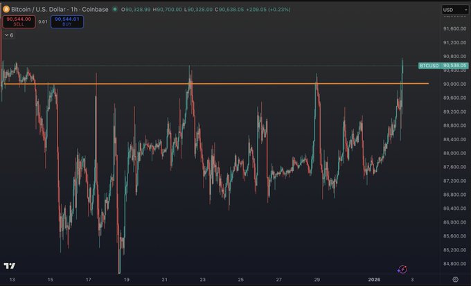 比特幣突破 9 萬美元大關 👀 目前處於 12 月 13 日以來的最高水平。