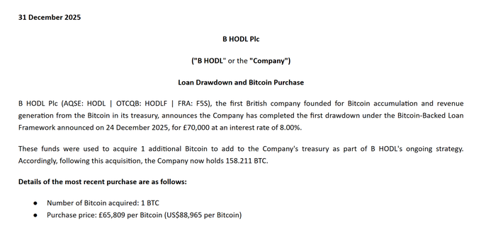 最新消息:總部位於英國的比特幣資金管理公司 B HODL購買了 1 個BTC,使其持有量達到 158 個BTC(1400 萬美元)。