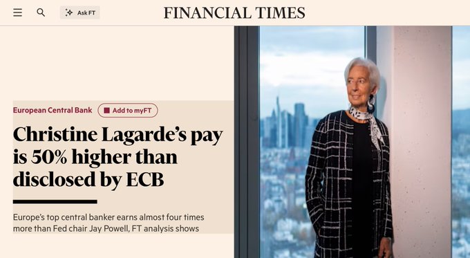 《金融時報》揭露克里斯蒂娜·拉加德的真實收入 據《金融時報》分析,克里斯蒂娜·拉加德的實際收入遠超其公開的薪水。 這位歐洲央行行長2024年的收入約為72.6萬歐元,比她46.6萬歐元的“基本”薪水高出約56%。 僅憑基本薪水,拉加德就已成為歐盟收入最高的官員。歐盟委員會主席烏爾蘇拉·馮德萊恩的基本薪水比她低21%。 除此之外,拉加德還獲得約13.5萬歐元的住房及相關福利,以及約12.5萬歐元的國際清算銀行董事會成員津貼。 她的總收入幾乎是美聯儲主席傑羅姆·鮑威爾的四倍,鮑威爾的薪水受法律限制,上限為20.3萬美元(約合17.3萬歐元)。