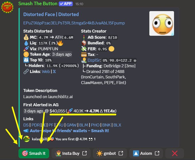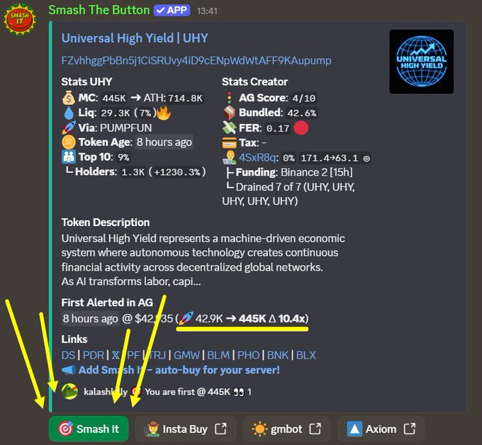 看電影?Discord聊天室裡依然播放著勁爆歌曲。💣 他們發現 $UHY → 點擊“粉碎它” → 所有人自動購買。 按下按鈕 + @agsniperbot = 免費自動狙擊COMBO🤖