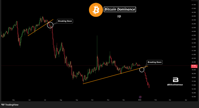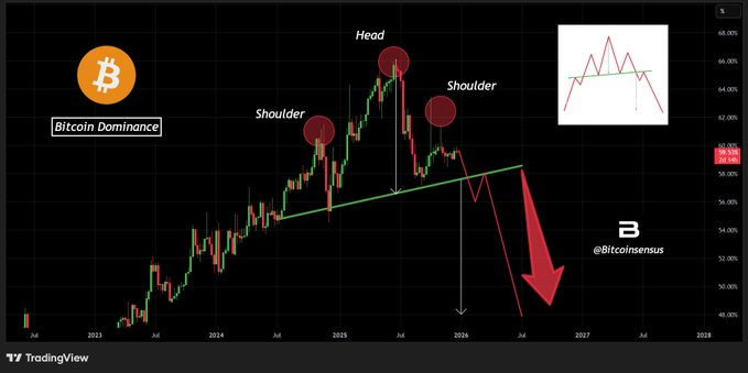 #比特幣主導 頭肩形態形成📉💥 這種健康與安全狀況的惡化可能導致資金大規模湧入#山寨幣。 🎯 比特BTC穩定下跌至 50%。