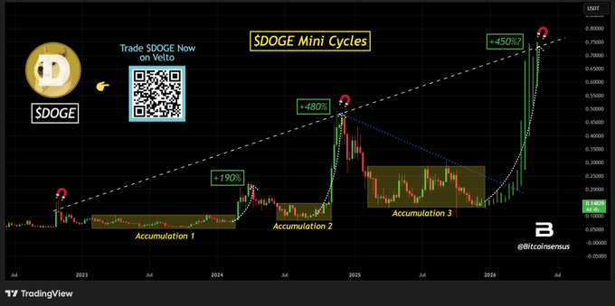 $DOGE 有可能上漲至 0.75 美元?📈🎯 Dogecoin很有可能大幅上漲至白色虛線阻力線。 之前的每一次積累階段都導致了價格的強勁上漲。✅ 所以這或許預示著接下來會發生什麼。🔥(NFA)