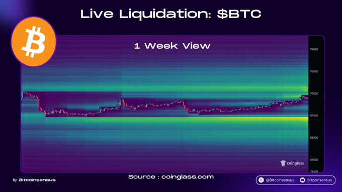 $BTC 流動性爭奪戰正在進行中!📊 📈 熱力圖顯示,9萬美元附近出現大量清算集群 價格緩慢上漲,最終被大量空頭清算包圍 預計價格將出現波動,因為巨鯨會湧入這些區域,試圖套牢後期空頭 #比特幣 #加密貨幣