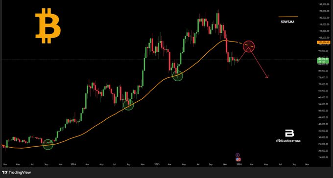$BTC 跌破 50 週均線! 🔻 📉 週線收盤價跌破關鍵長期支撐位-多頭失控 101.6 萬美元是多頭必須奪回的價位,才能重新掌控局面 若在此受阻,可能引發進一步下跌 #比特幣 #加密貨幣