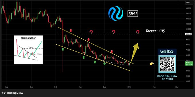 #Injective日線看漲楔形形態正在形成📈🎯 $INJ 即將突破始於 2025 年 10 月的下降楔形形態。 突破黃色阻力線可能導致價格大幅上漲至 10 美元 ✅ Injective基本面依然強勁。 (內容不構成財務建議)